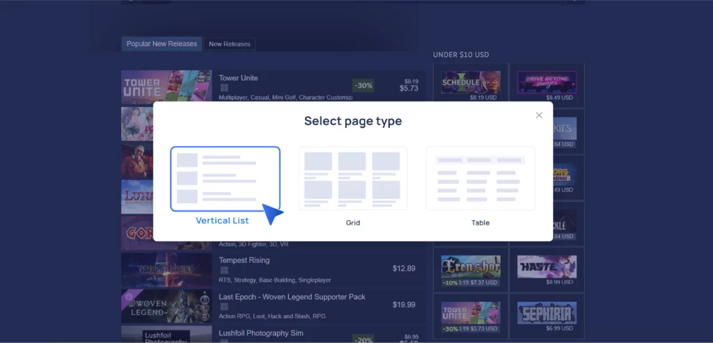 - Set up Pagination by choosing the Load More button, as Steam uses it to display additional game listings.